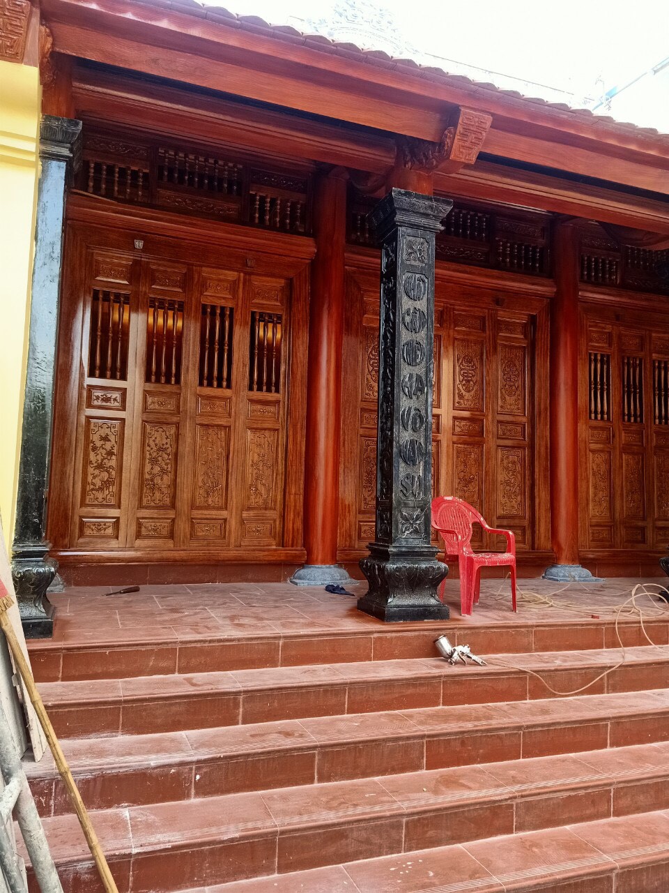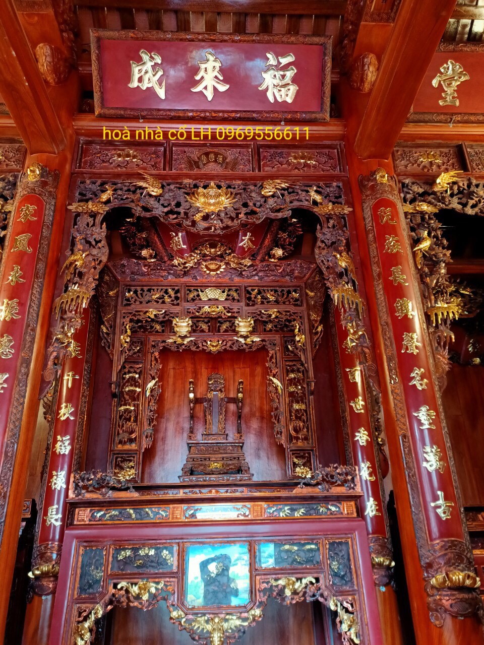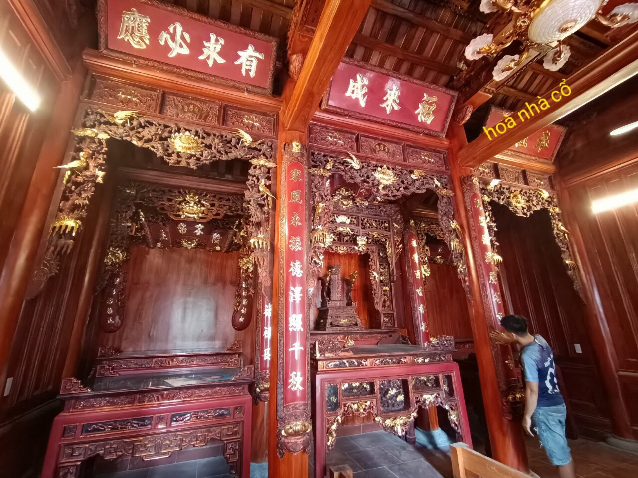 Bốn chín hàng cột lim già vài trăm năm tuổi cùng hàng trăm khối gỗ quý tạo thành hình hài ngôi nhà gỗ có một không hai. 60 cây vàng được giát vào hoành phi,...