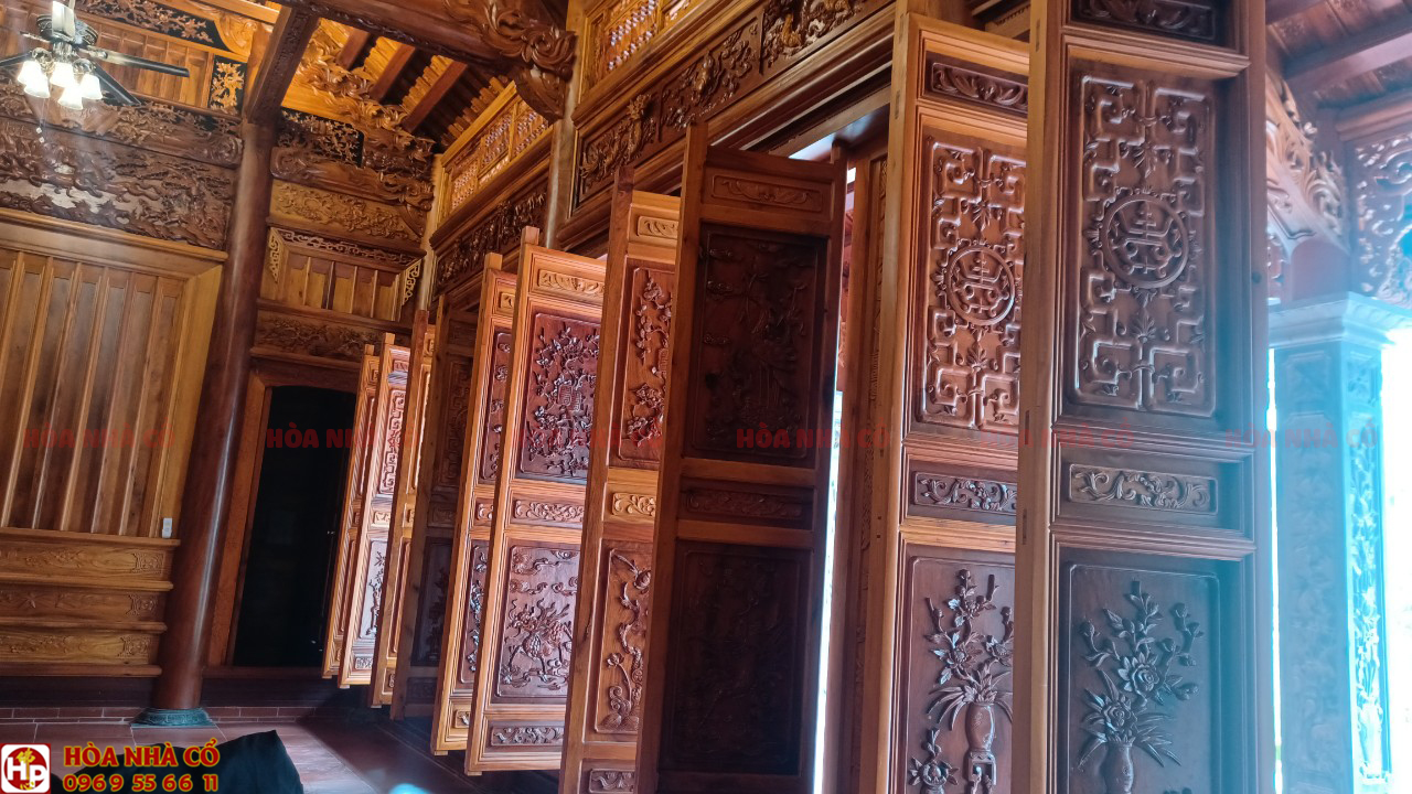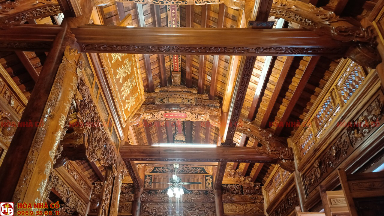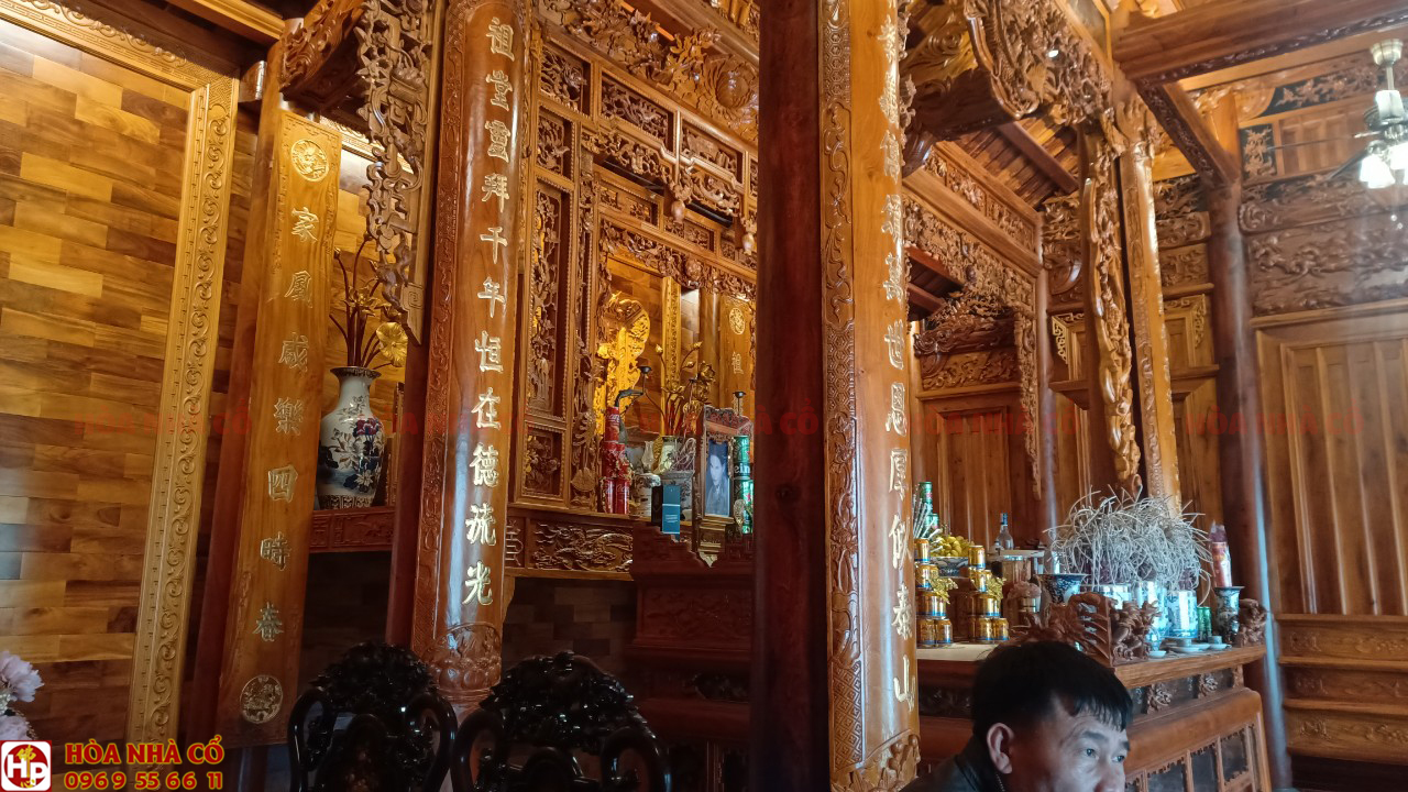 Bốn chín hàng cột lim già vài trăm năm tuổi cùng hàng trăm khối gỗ quý tạo thành hình hài ngôi nhà gỗ có một không hai. 60 cây vàng được giát vào hoành phi,...