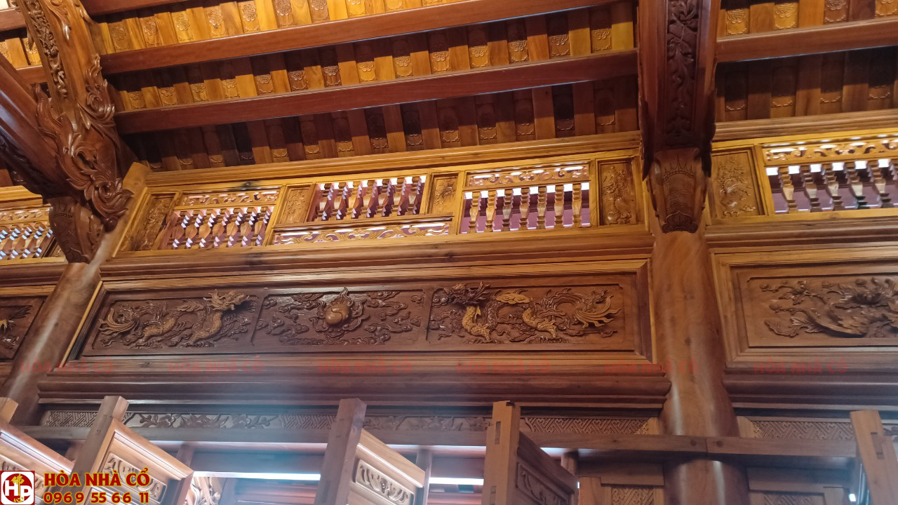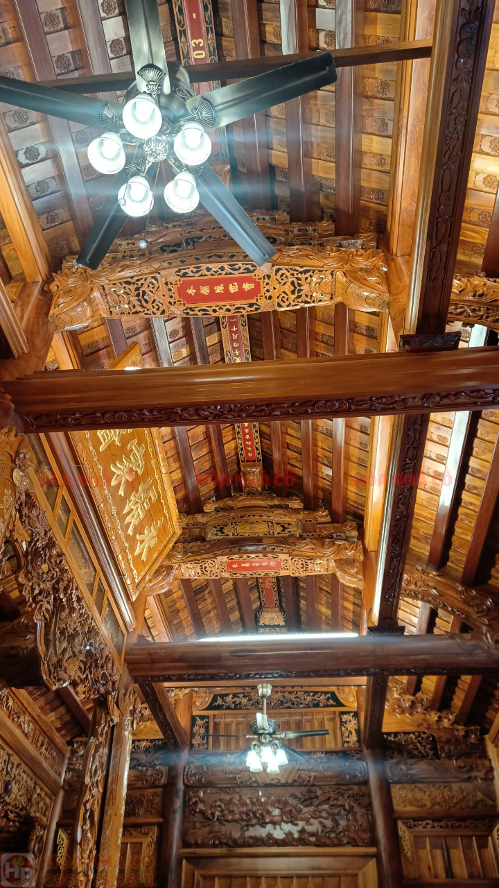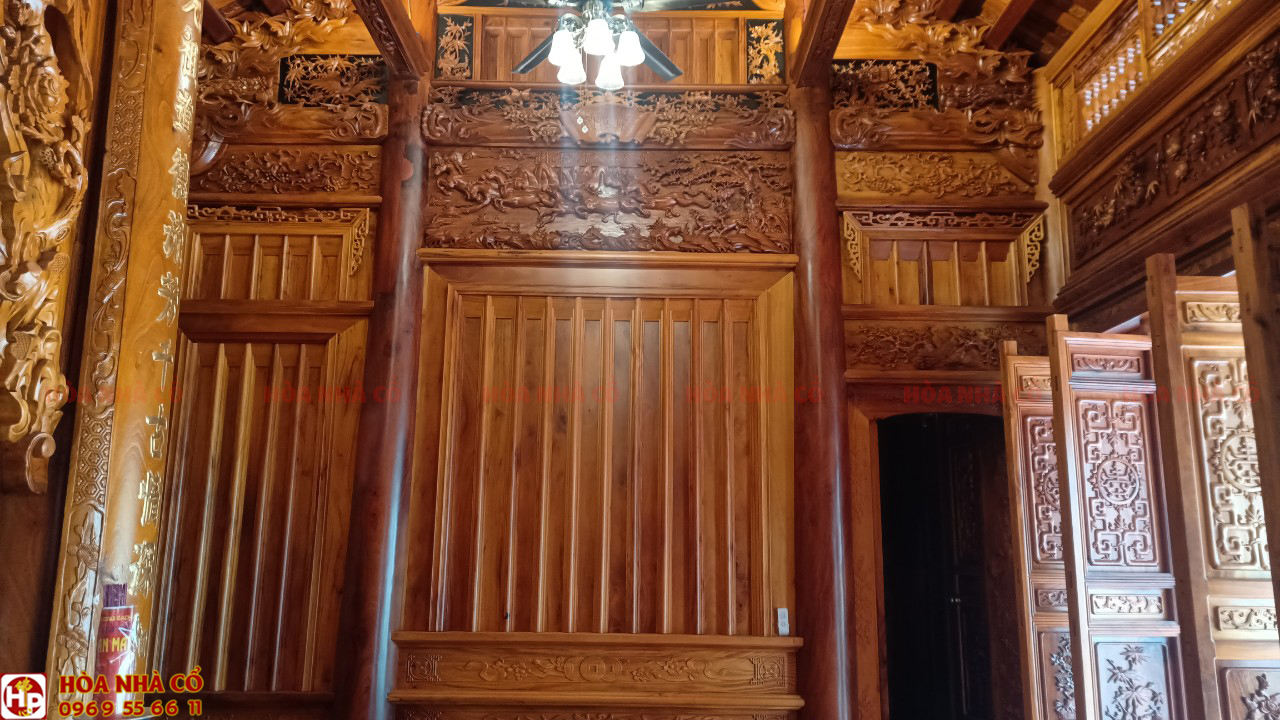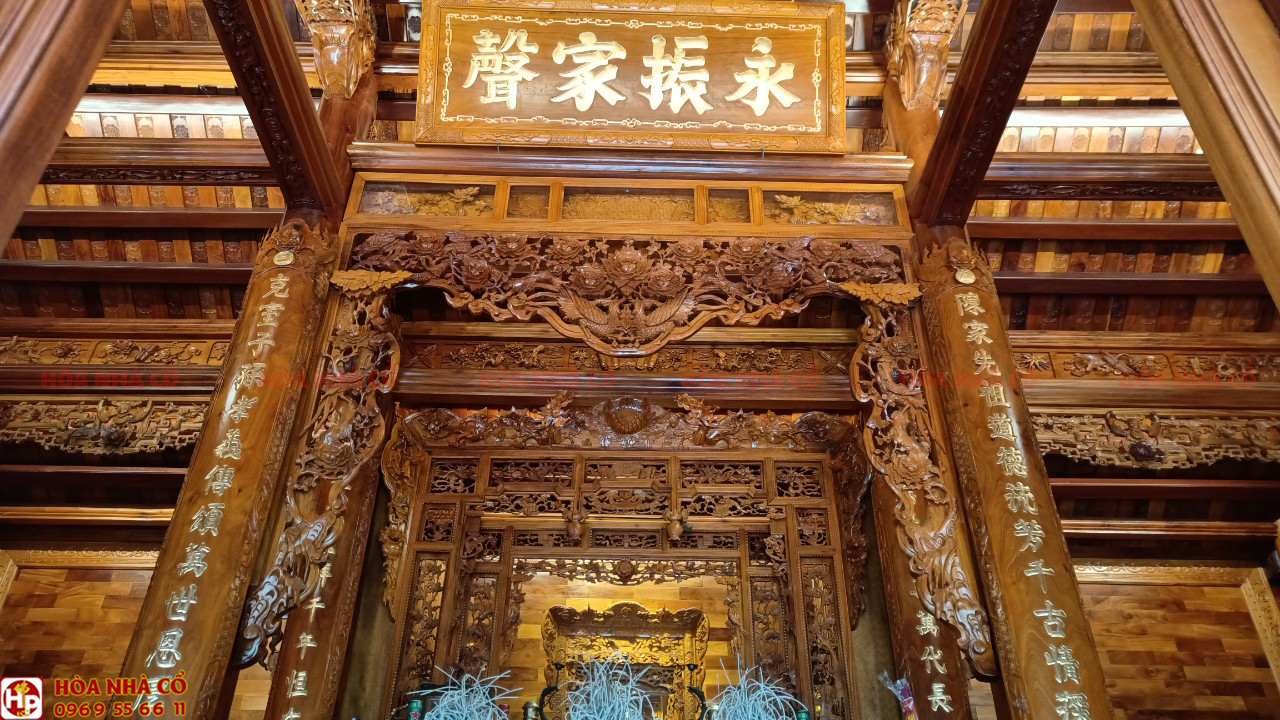 Bốn chín hàng cột lim già vài trăm năm tuổi cùng hàng trăm khối gỗ quý tạo thành hình hài ngôi nhà gỗ có một không hai. 60 cây vàng được giát vào hoành phi,...