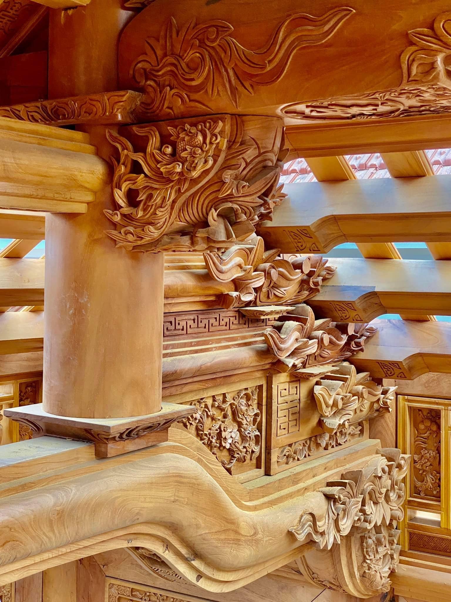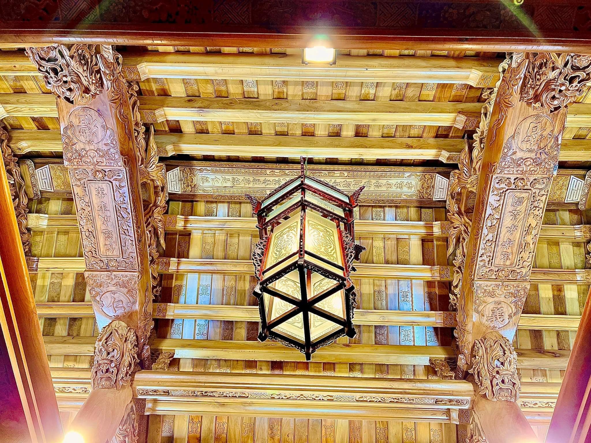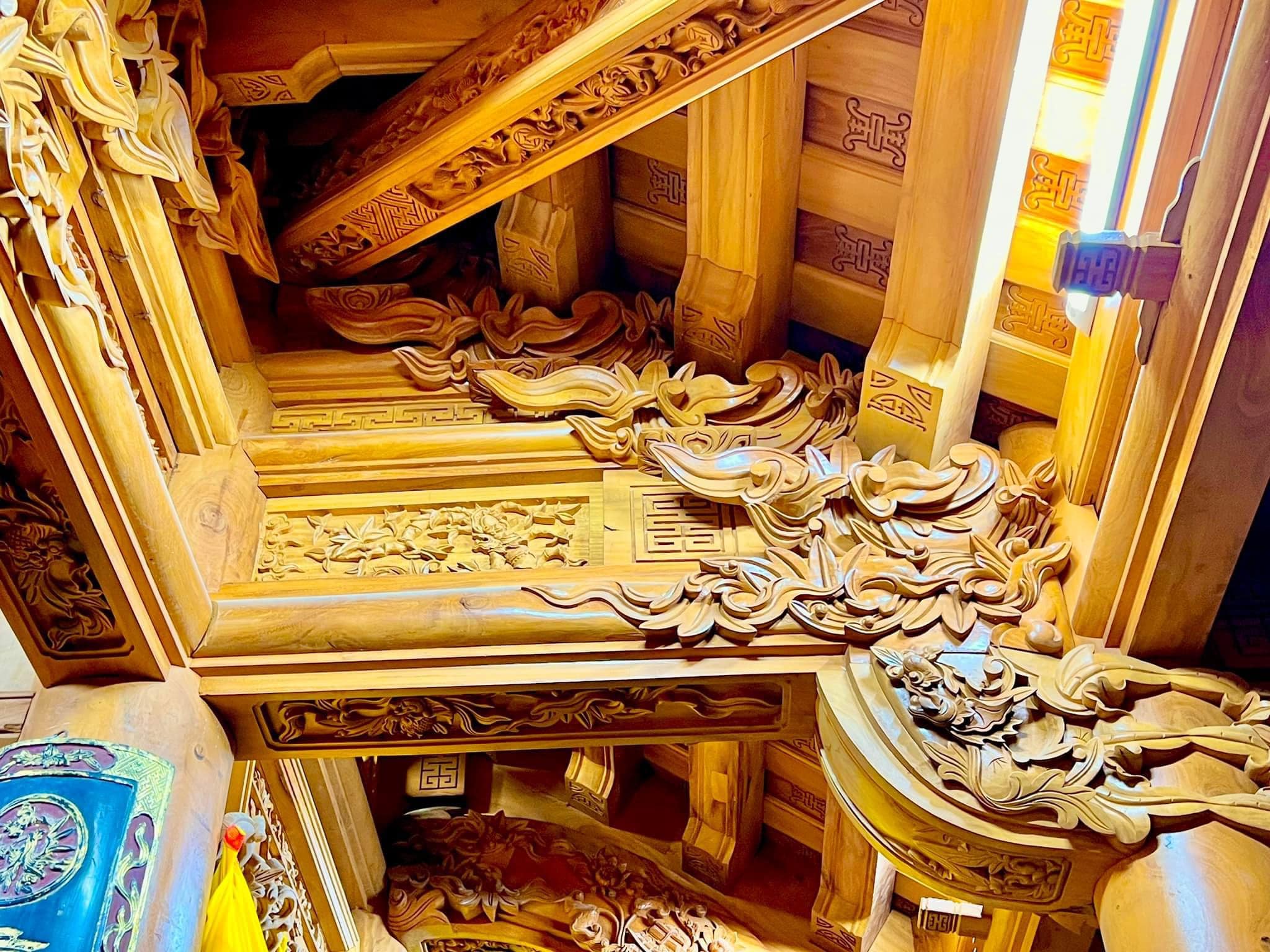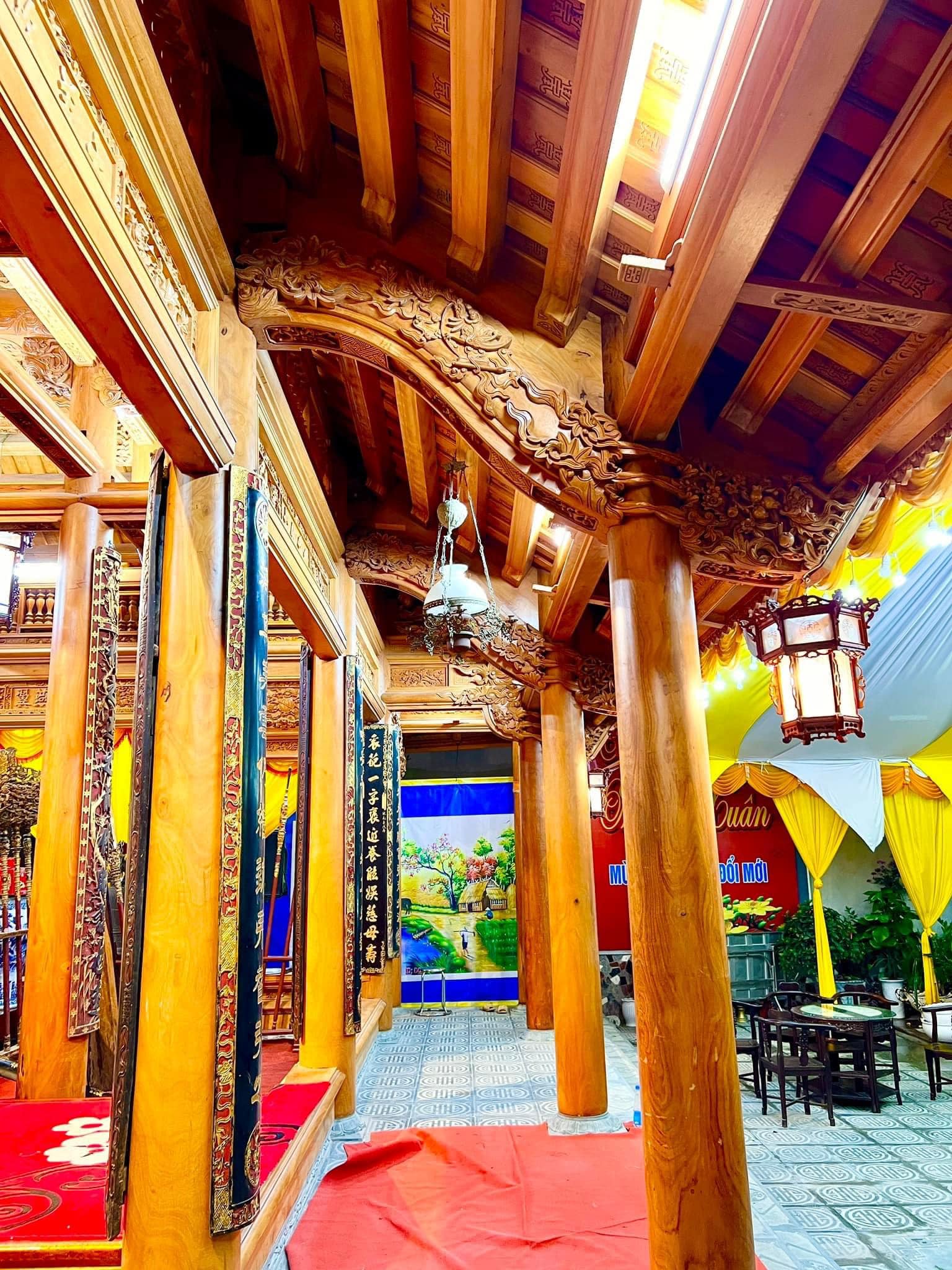 Bốn chín hàng cột lim già vài trăm năm tuổi cùng hàng trăm khối gỗ quý tạo thành hình hài ngôi nhà gỗ có một không hai. 60 cây vàng được giát vào hoành phi,...