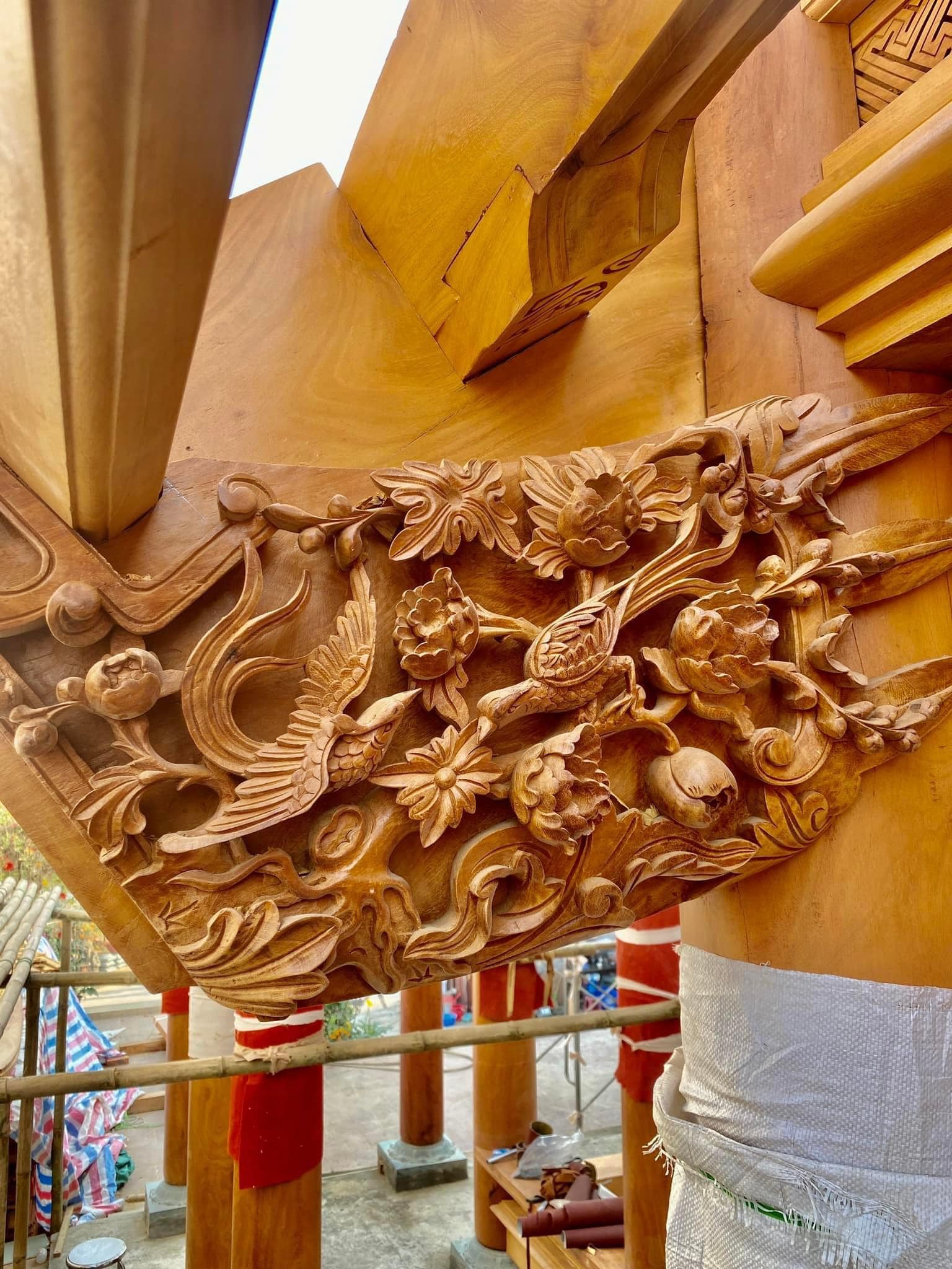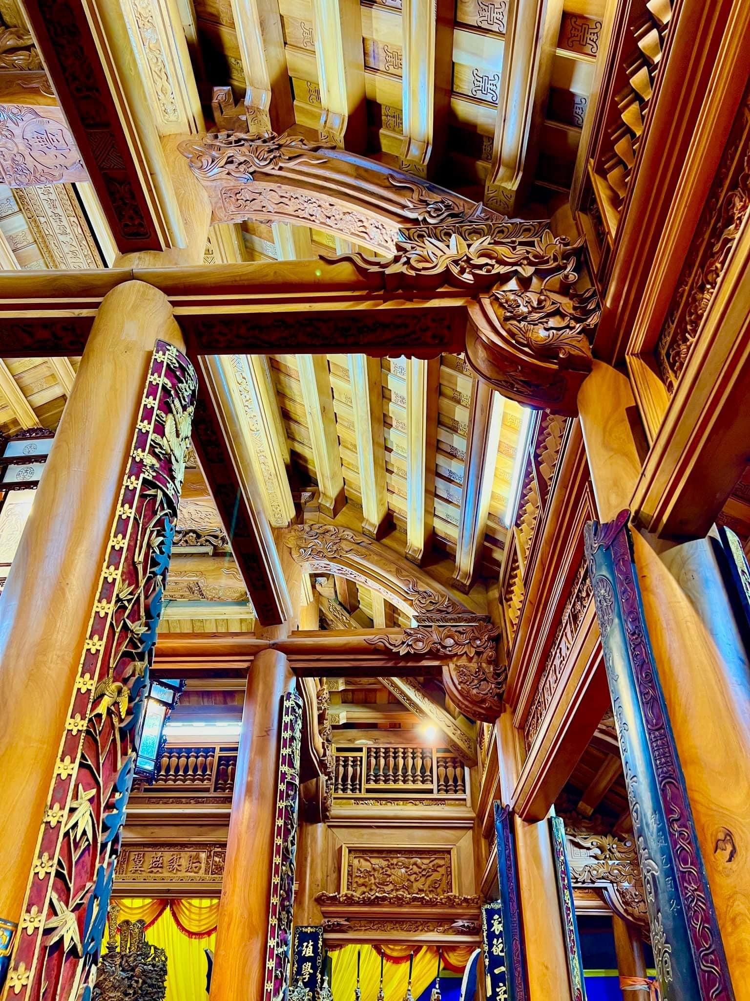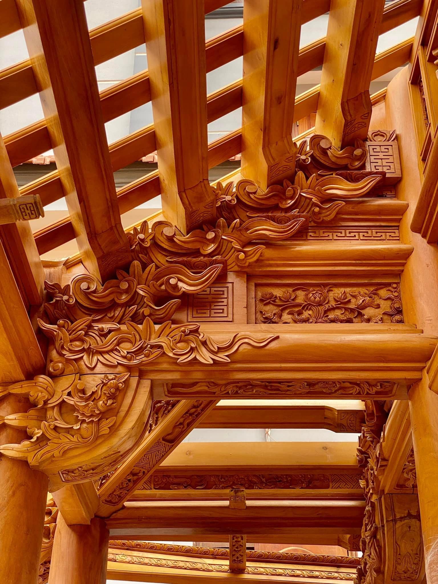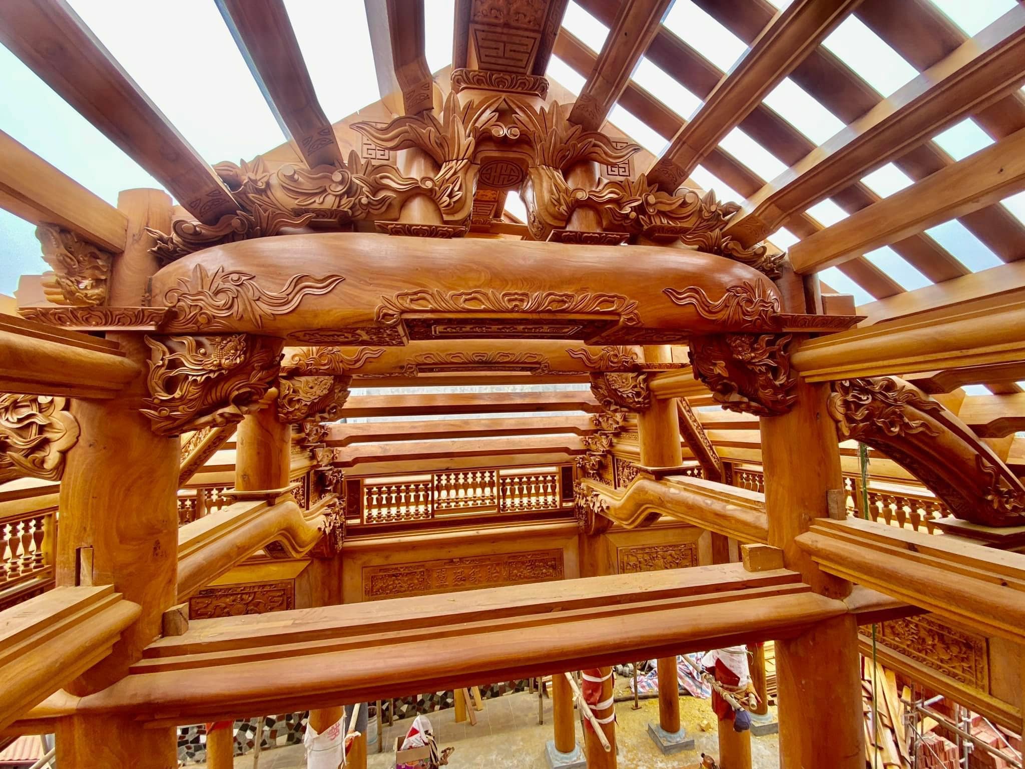 Bốn chín hàng cột lim già vài trăm năm tuổi cùng hàng trăm khối gỗ quý tạo thành hình hài ngôi nhà gỗ có một không hai. 60 cây vàng được giát vào hoành phi,...